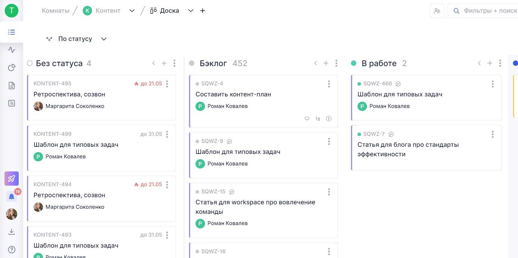 - Автоматически собирает статистику по команде для отчетов: количество задач в работе, просроченных, завершенных, среднее время работы на задачу.