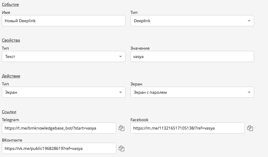 Используется для создания ссылки, которая ведет на определенный экран. Например, вы сгенерировали Диплинк vasya, чтобы считать клиентов, которые привел ваш партнер Василий. Для этого вы отправите всех пользователей на экран, записывающий визит.