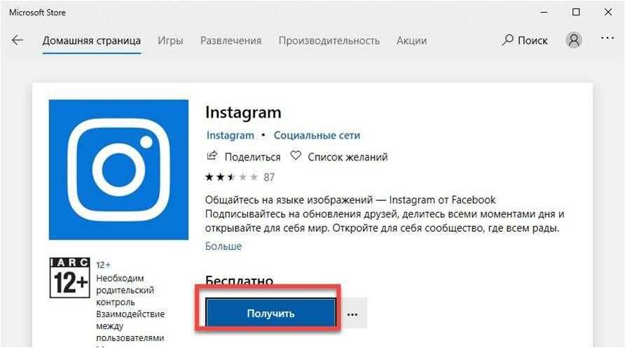 Но нужно понимать, что в браузере можно общаться с другими людьми только со своего телефона. К сожалению, на ПК это пока невозможно. Но не стоит грустить, ведь всегда можно найти альтернативные пути. Например, установив программу Instagram на компьютер с Windows. Вы можете бесплатно скачать его в Microsoft Store. Для этого введите название приложения в строку поиска, перейдите на нужную страницу и нажмите «Получить».
