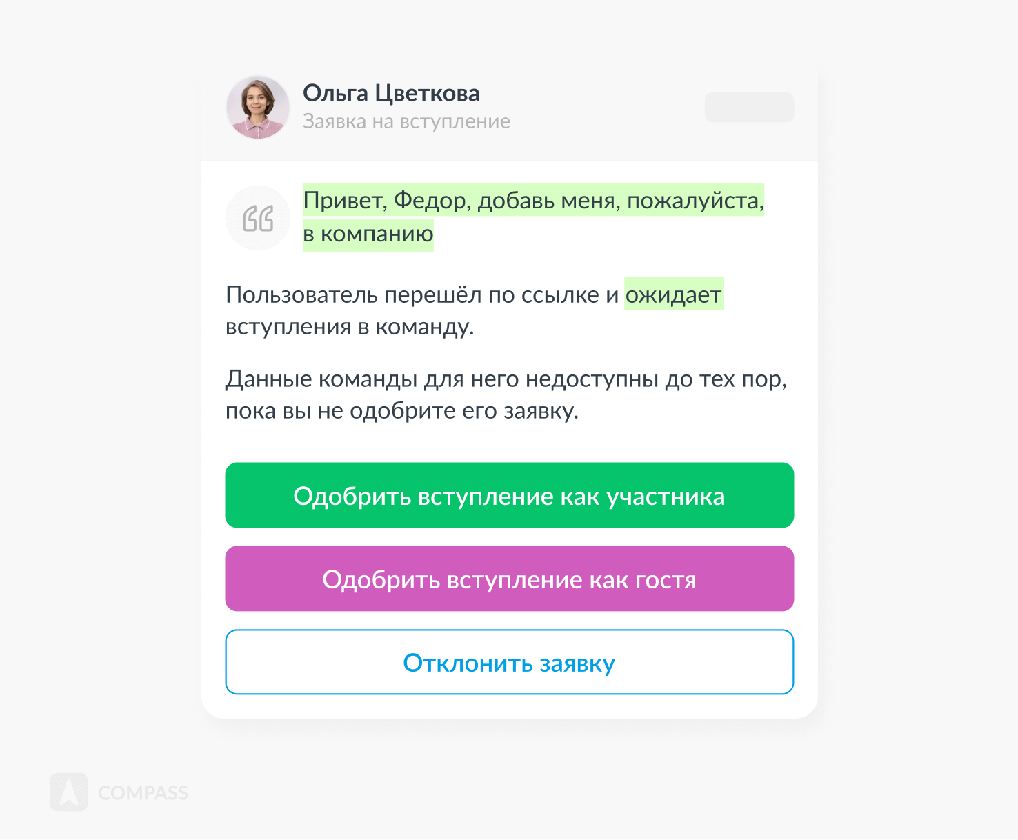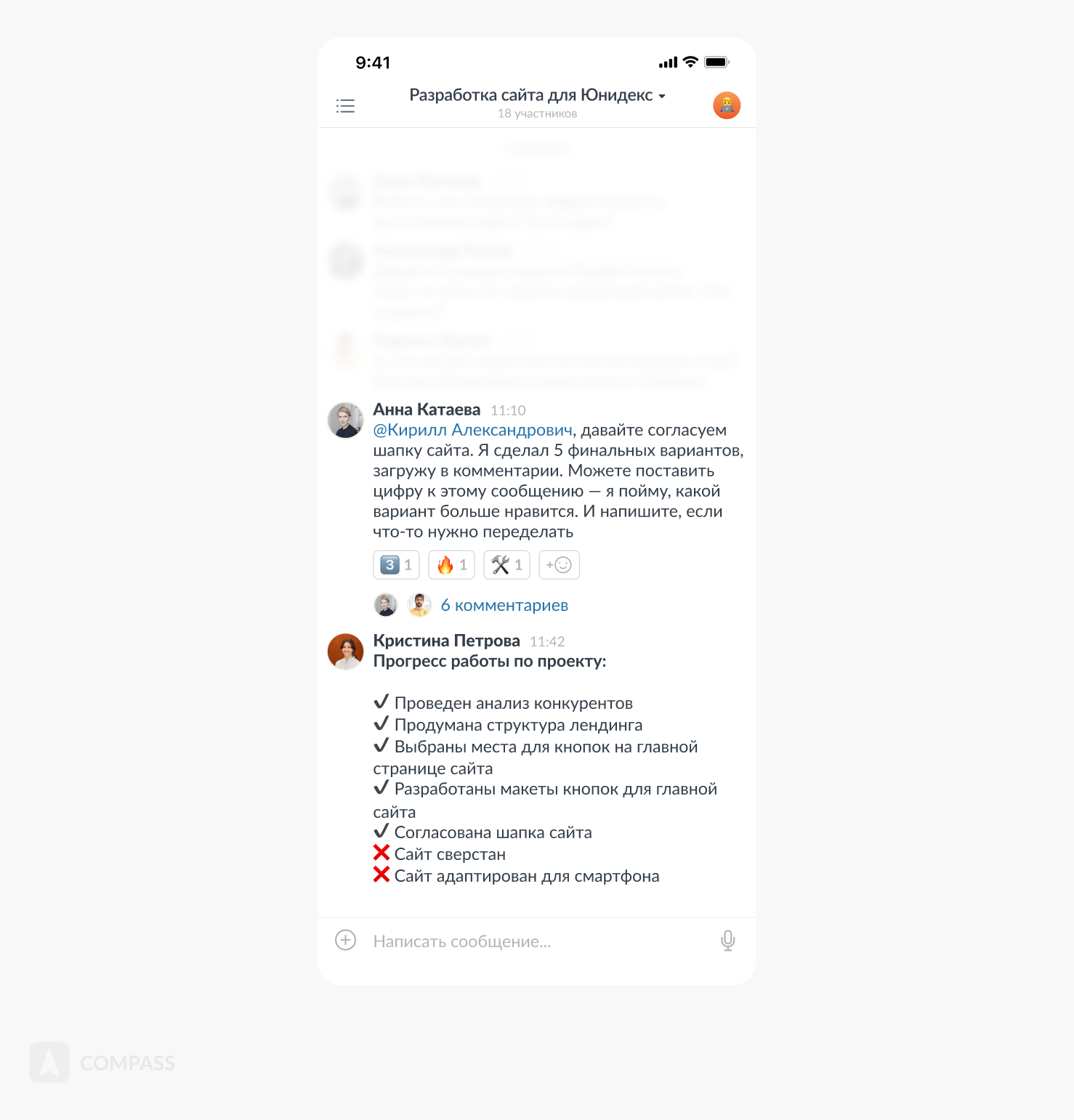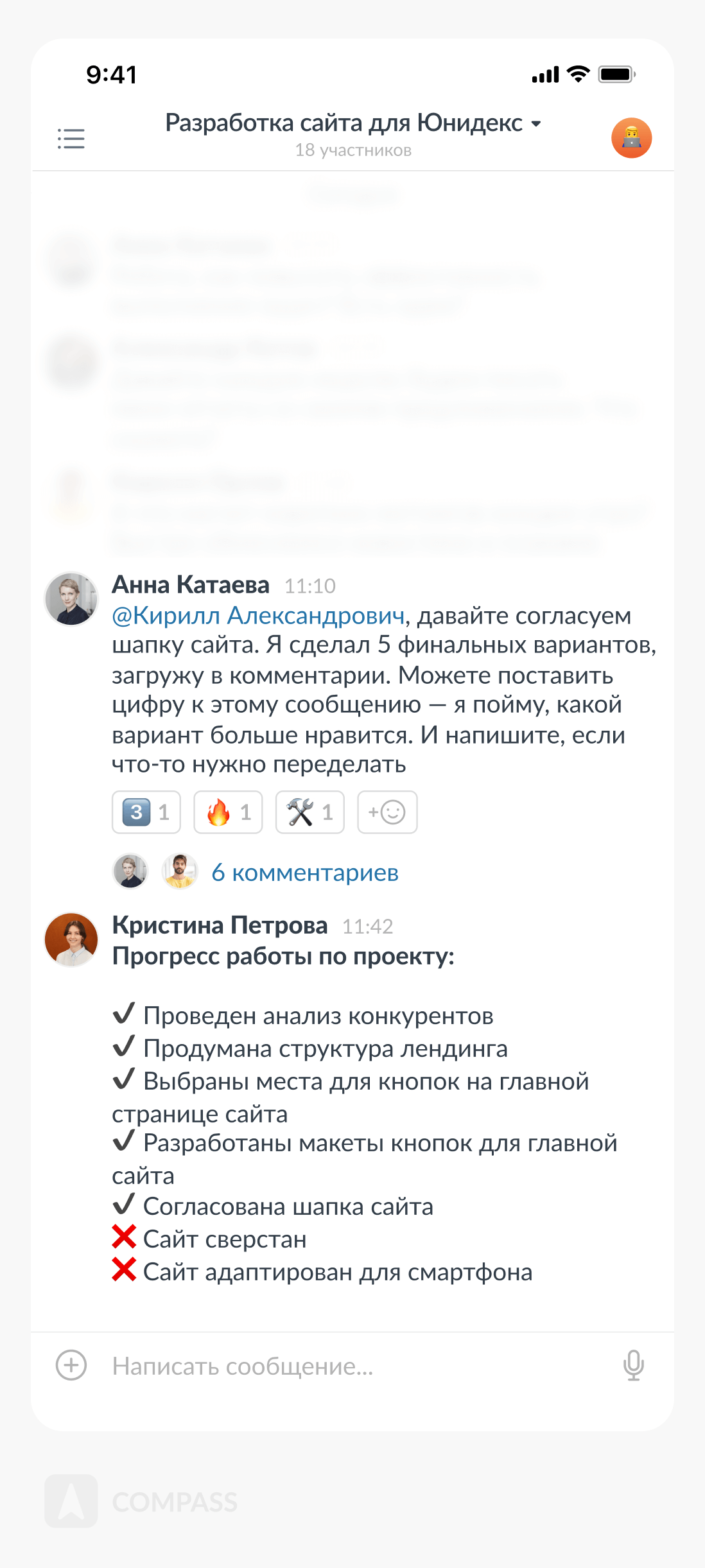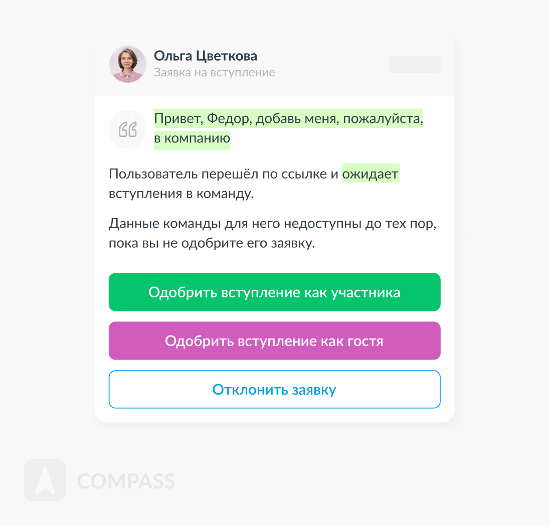 Compass — корпоративный мессенджер с функцией гостевого доступа. Здесь сотрудники общаются друг с другом, с клиентами и подрядчиками. Гостевой доступ — бесплатная опция, компания не платит за гостей.