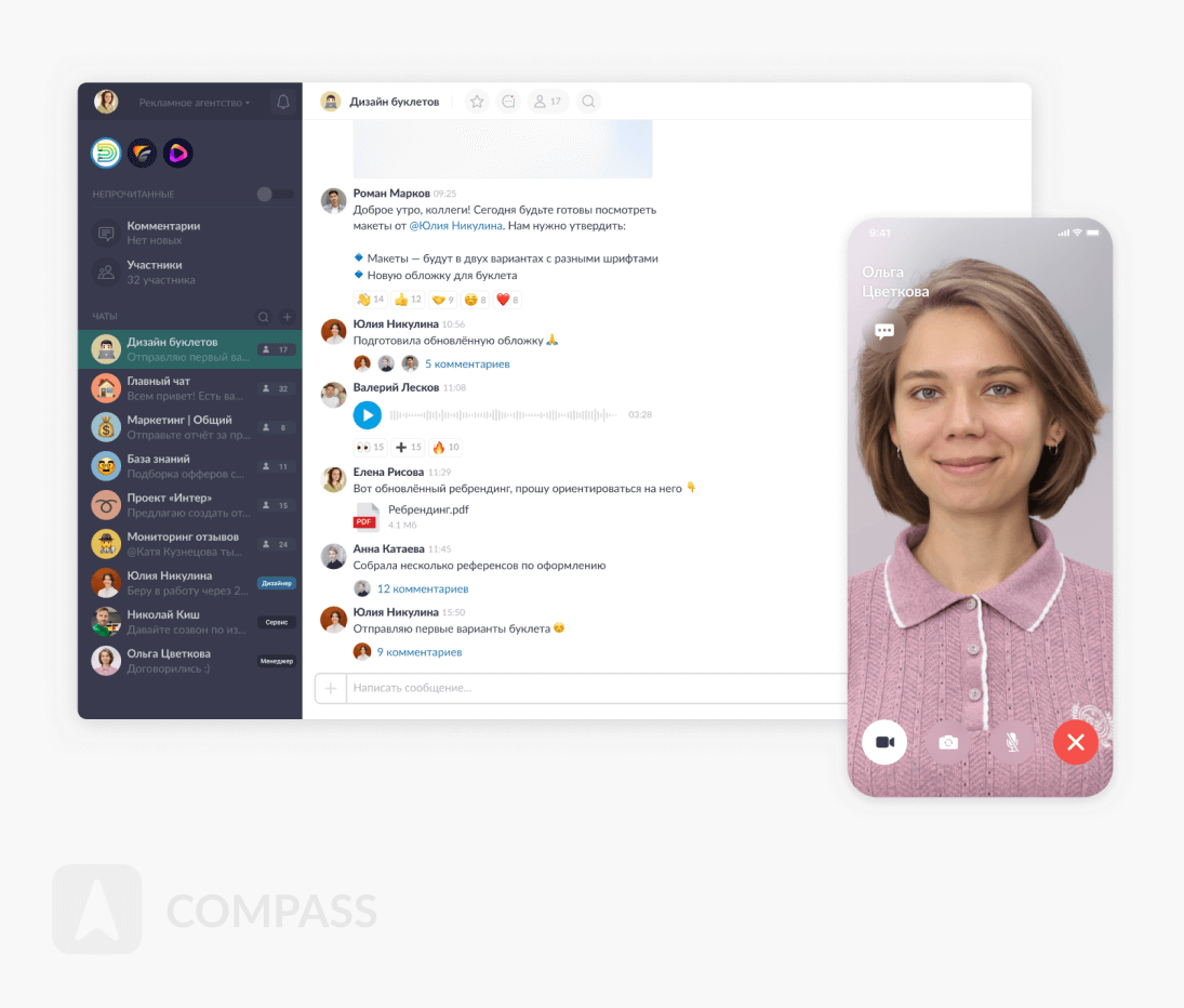 Compass — решение для тех компаний, у которых есть постоянные клиенты или для тех, кто работает с заказчиком долгое время и хочет выстроить систему взаимодействия с покупателями. Это сервис для длительной поддержки клиентов через чат и решения проектных задач, когда нужны промежуточные согласования и заказчик хочет видеть прогресс работы над проектом.