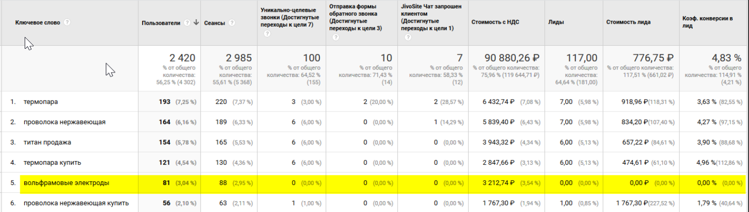 На примере видно, что одна фраза не принесла ни одного лида, хотя получила довольно много трафика — с учетом средней конверсии сайта такое количество посещений должно было принести 3-4 лида. Эта фраза — кандидат на отключение. Однако спешить не стоит — сначала нужно проанализировать всю группу фраз, которая относится к этому направлению и поискать причину. Проблема может быть в посадочной странице.