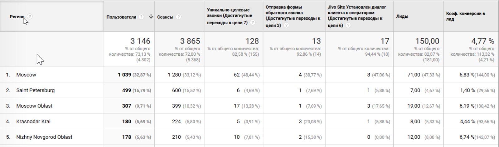 Анализ показал, что кампании некоторых городов из Московской области в геотаргетинге не приносят конверсий, поэтому мы решили их отключить.
