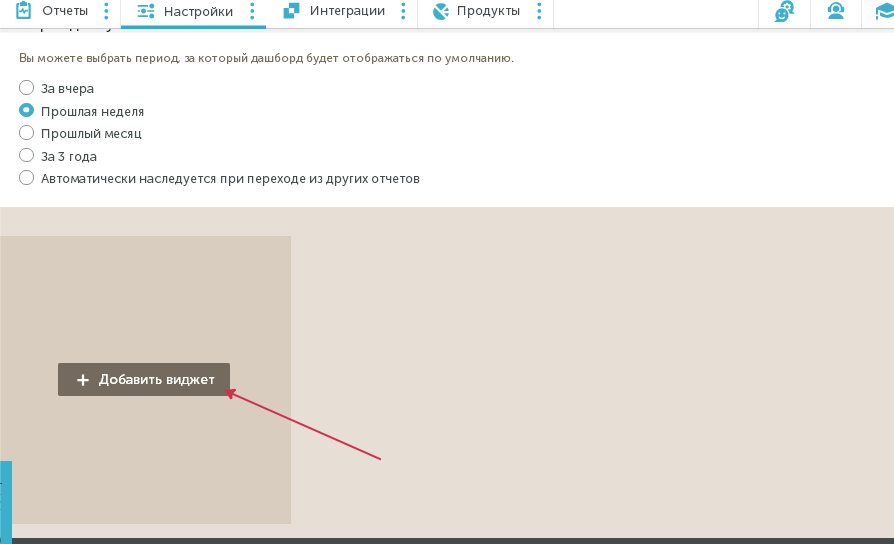 В меню “настройки”, раздел “отчеты”->”Дашборды”, можно создать свой “Dashboard”. Для этого перейдите в соответствующую вкладку заполните поля и добавьте виджет пример на картинке.
