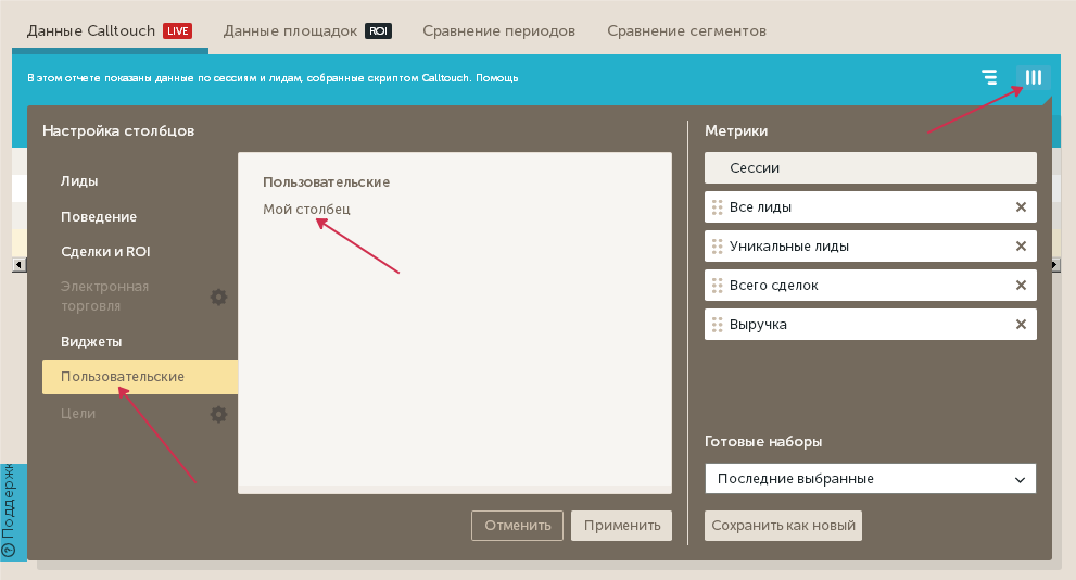 Вы всегда сможете изменить настройки, добавить новые столбцы или переставить их местами. Для этого перейдите в меню навигации “Отчеты” и выберите “все источники”. Дальше найдите таблицу и щелкните по кнопку “Столбцы”. Дальше выберите “Пользовательские”, там вы найдете свою запись, например “Мой столбец”, которую мы создали ранее.