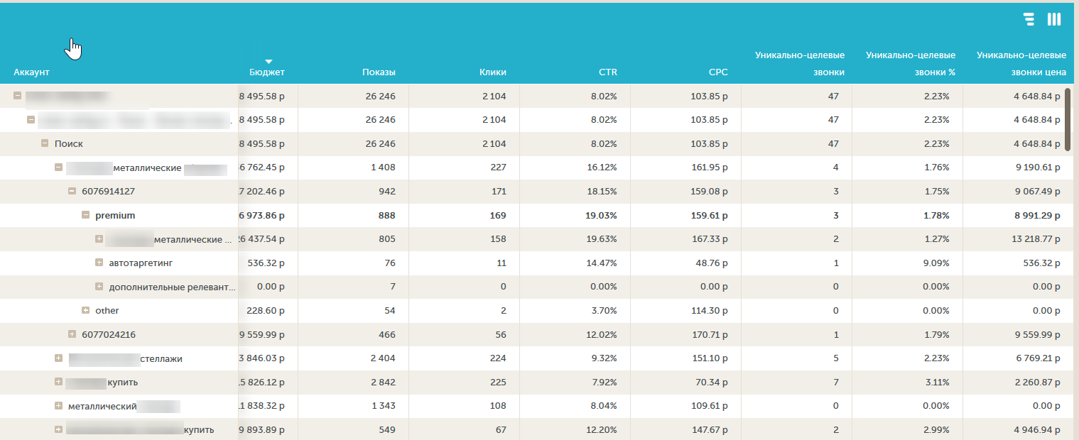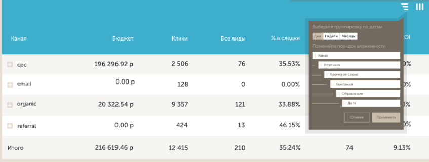Данные сегментируются по каналу, рекламной кампании и конкретной ключевой фразе. Можно посмотреть, какие кампании или фразы работают лучше/хуже, и оптимизировать рекламную кампанию.