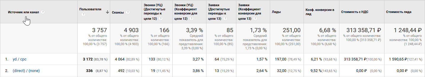 Теперь рассмотрим, как использовать данные коллтрекинга в Google Analytics. Чтобы в систему попадали данные о звонках, веб-аналитики настраивают соответствующие цели и передачу данных о расходах из Яднекс.Директа — по умолчанию они не попадают в Google Analytics.