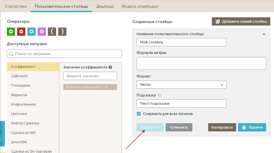 После заполнения всех полей нажмите “сохранить”. Придумайте название, например “Мой столбец”