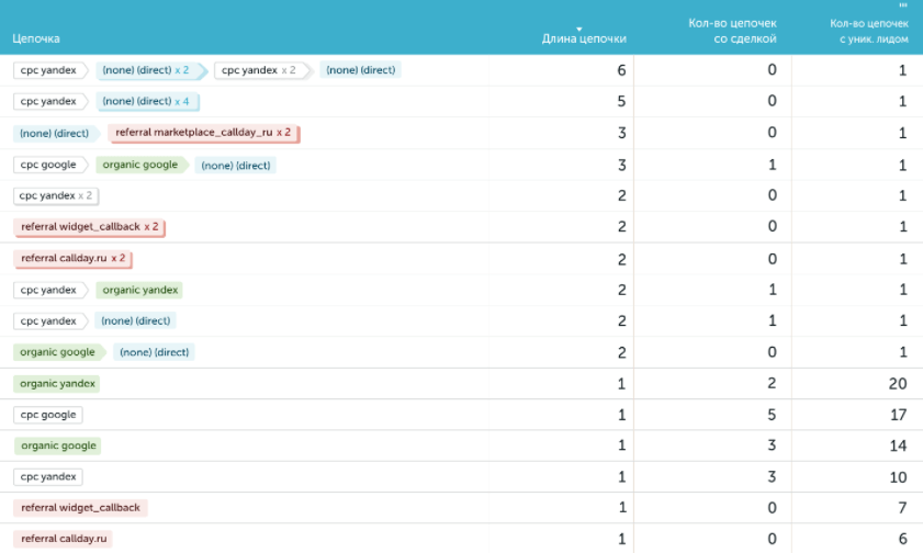 На скриншоте ниже приведена история визитов клиента, состоящая из трех действий: два раза он перешел на сайт через рекламу в Яндексе, а на третий — уже через SEO, что и привело к звонку и заказу.
