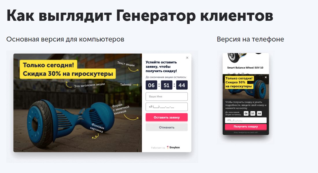 Когда услуга обратного звонка стала востребованной, мы сделали второй продукт – генератор клиентов – всплывающее окно с таймером и с акцией, которая собирает со 100 посещений сайта 20-30 клиентов дополнительно.