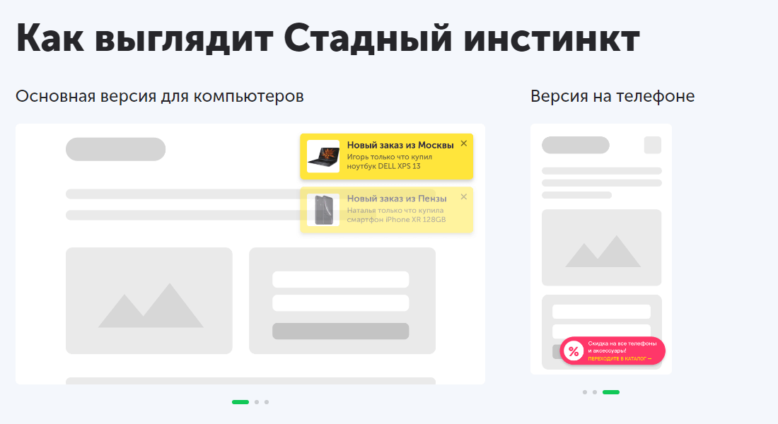 Стадный инстинкт – виджет, показывающий искусственную очередь из клиентов на сайте и побуждающий пользователей тоже совершить покупку.