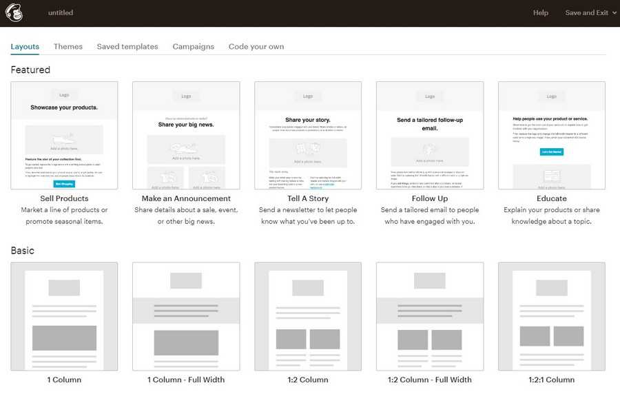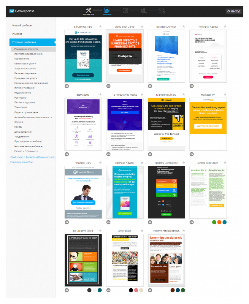 Сервис позволяет создать письмо для рассылки с нуля или на основе готовых шаблонов: