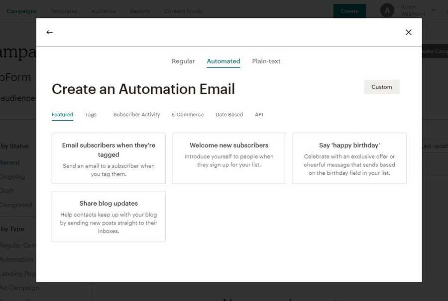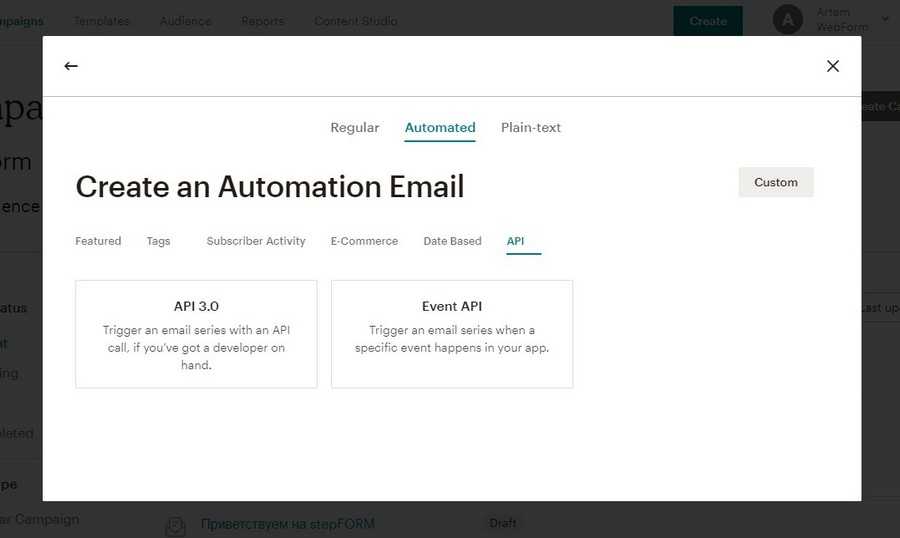 Помимо обычных рассылок MailChimp позволяет создавать цепочки триггерных писем на определенные действия пользователей.