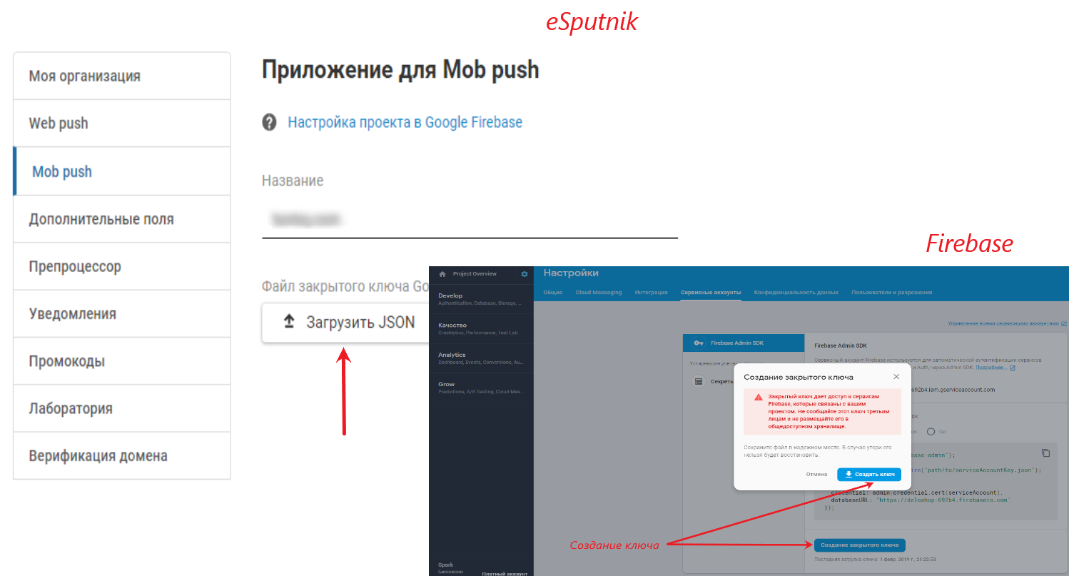 Mob–push настраивают несколько по-другому, но тоже с использованием сервиса Firebase. На Firebase необходимо будет сгенерировать закрытый ключ в виде JSON-файла, полученный файл – загрузить на еСпутник.