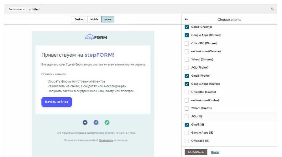 И конечно же, можно протестировать письмо в эмуляторе почтовых клиентов: