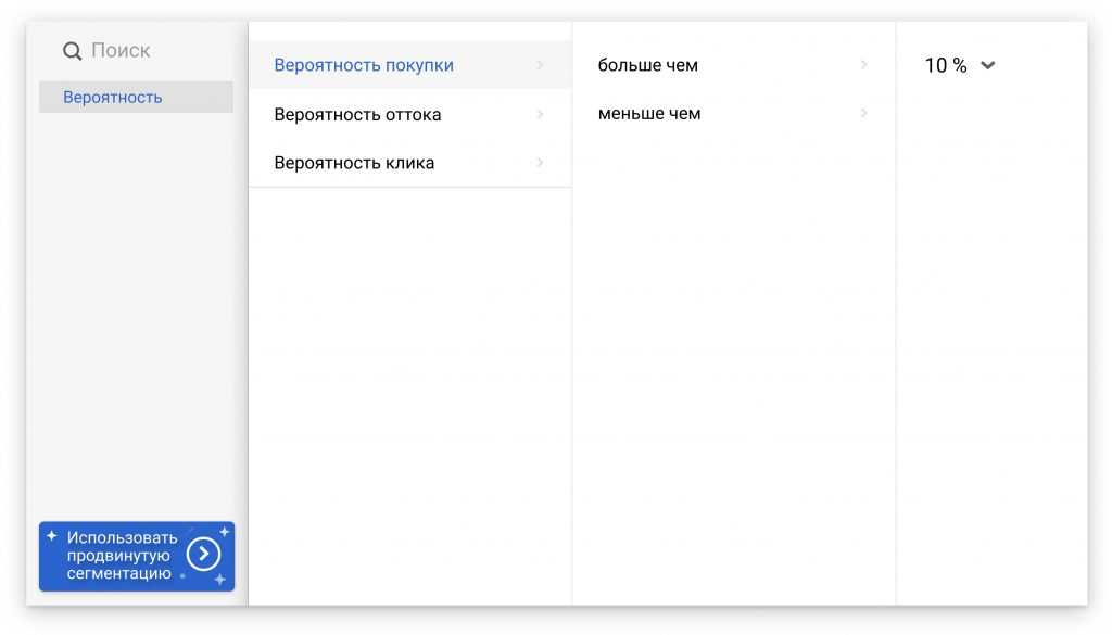 eSputnik предлагает набор готовых сегментов, которые предполагают вероятность покупки или оттока клиентов. Бизнес может быстро настраивать кампании, основываясь на предиктивной модели, а не более простых решениях вроде «не покупал Х дней». Это помогает вовремя удержать тех, кто может уйти, и с большей вероятностью получить прибыль от потенциальных покупателей.
