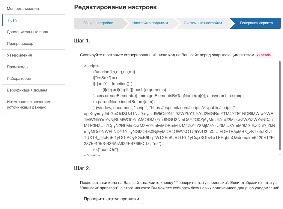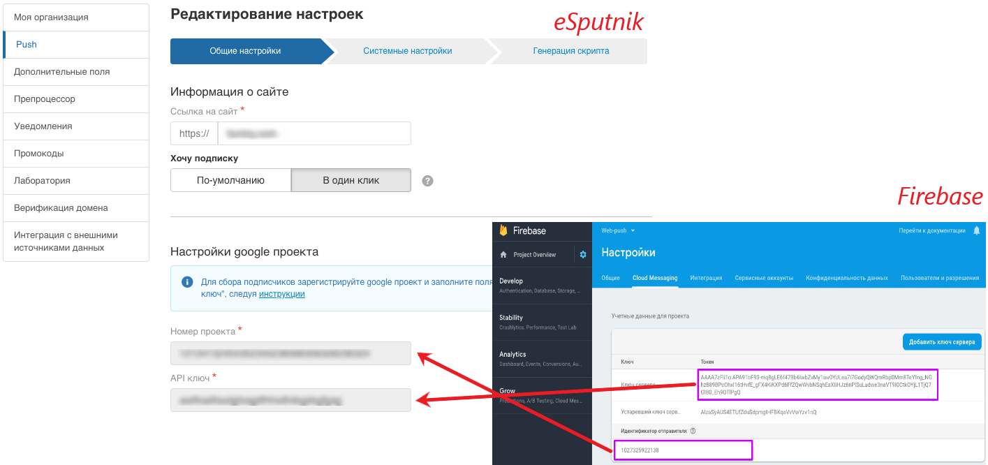 API-ключ и номер проекта из Firebase нужно скопировать в настройки web–push на еСпутнике. После этого привязка сайта будет близка к завершению.