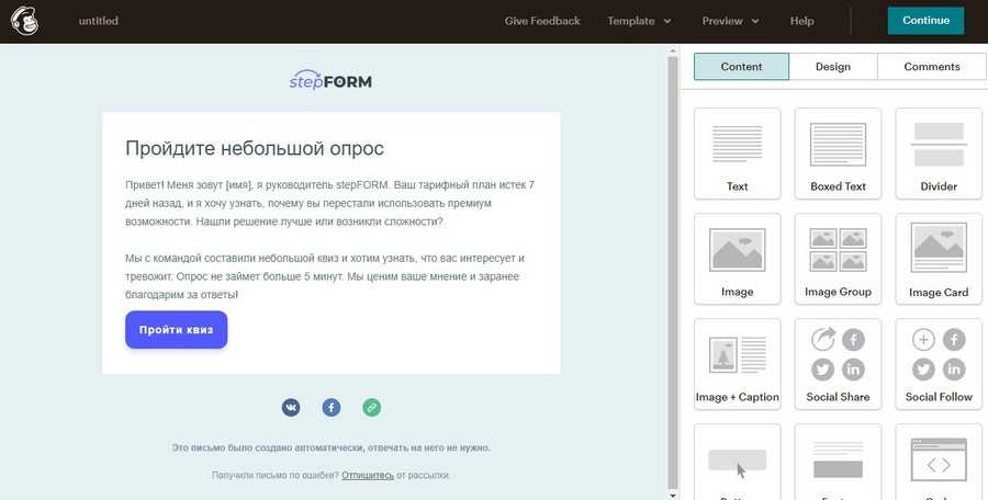 Письмо с нуля собирается в визуальном редакторе из готовых элементов: