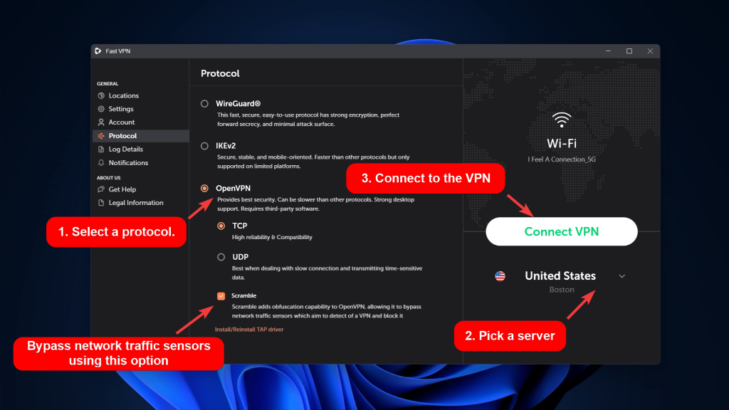 Protocol: This section on the Windows app allows users to choose from three protocols: WireGuard, IKEv2, and OpenVPN. When using OpenVPN, you can further select between TCP and UDP, with an additional Scramble option with obfuscation capabilities for bypassing network traffic sensors. Keep in mind that you can only switch protocols when you’re not connected to a server.