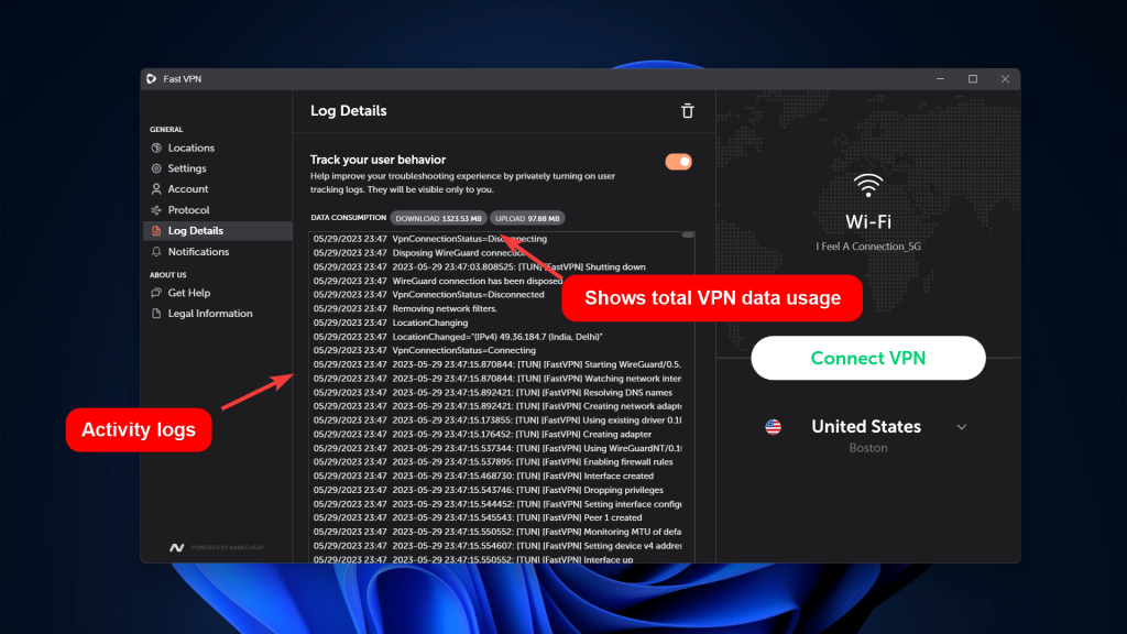 Log Details: This section provides you with valuable troubleshooting information by logging your VPN activities. It also displays the total data downloaded and uploaded through the VPN.