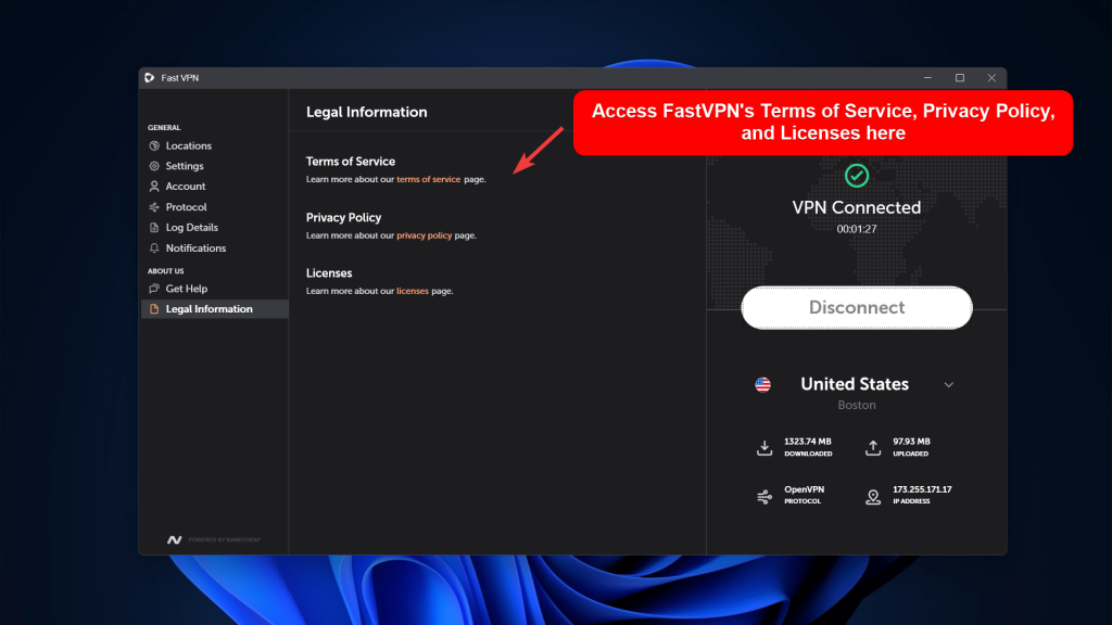 Legal Information: It’s important for a VPN to be transparent about its policy and compliance. To do that, the app provides access to important documents, including FastVPN’s Terms of Service, Privacy Policy, and Licenses, in this section.