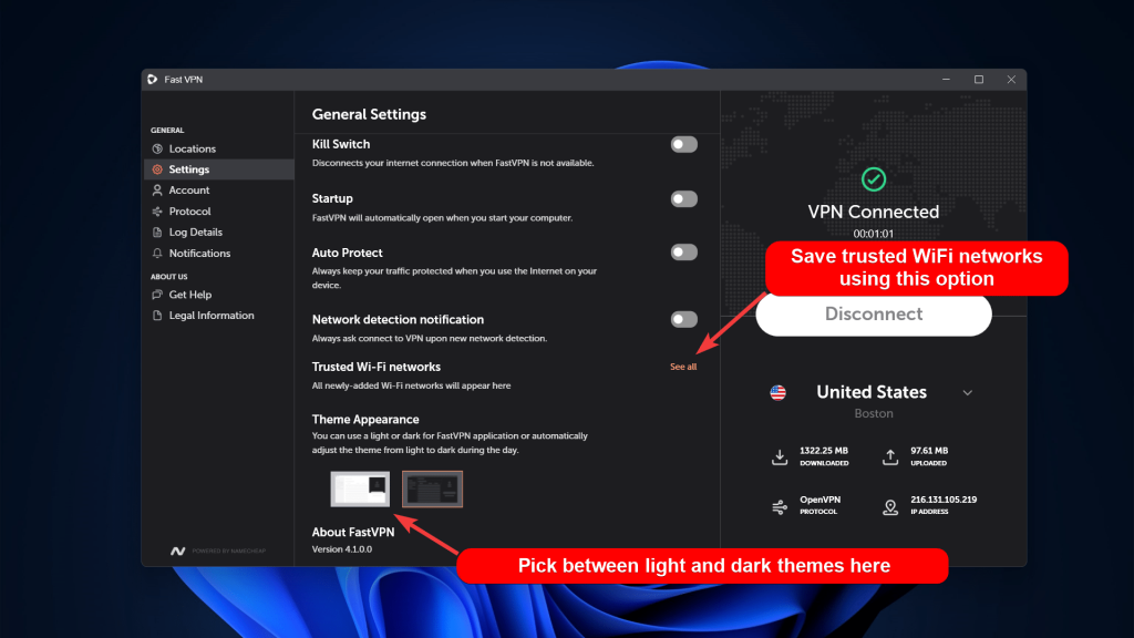 Settings: In this panel, you’ll find toggles and options to enhance your VPN usage. You can set Kill Switch, Startup, and Auto Protect features here to ensure continuous traffic security. There’s also the Network Detection Notification option to send you alerts every time it discovers a new network. Plus, you can customize the app’s appearance and save trusted WiFi networks conveniently from this section.