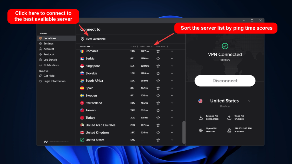 Locations: This section neatly organizes all the servers by their name. You can sort the list alphabetically or by load time or ping time scores. Moreover, favorite locations can be saved with a simple click on the star icon. Clicking on a location also reveals other available server options within that country.