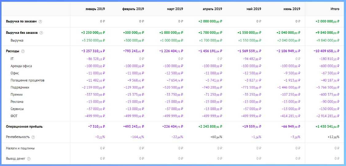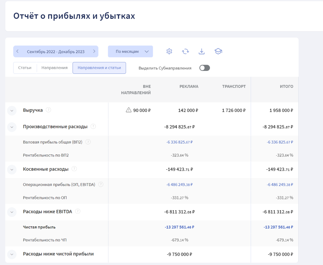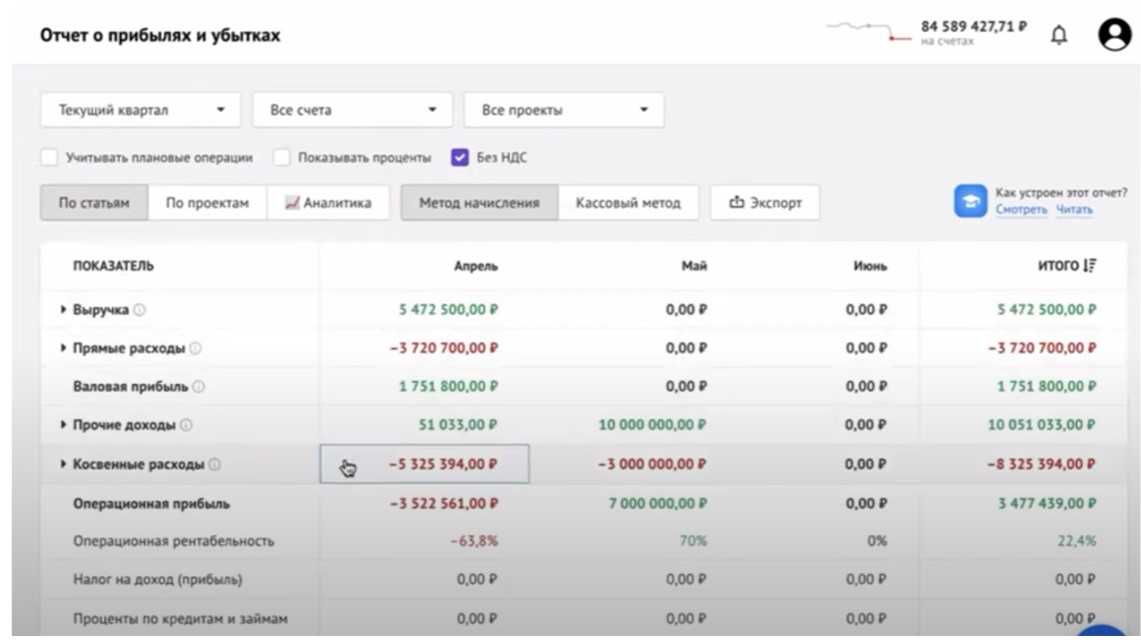 Отчет о прибылях и убытках в Финологе строится методом начисления на основе всех операций, которые есть в сервисе.