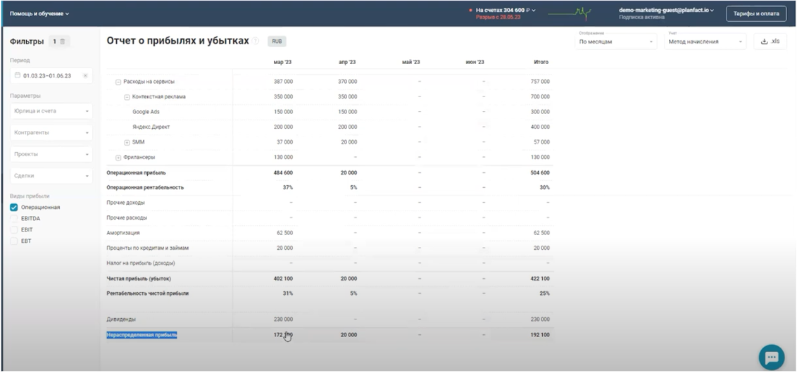 Отчет о прибылях и убытках в сервисе ПланФакт, также, собирается на основе имеющихся данных. Есть возможность выбора метода, по которому будет собран отчет: начислением или кассовым.