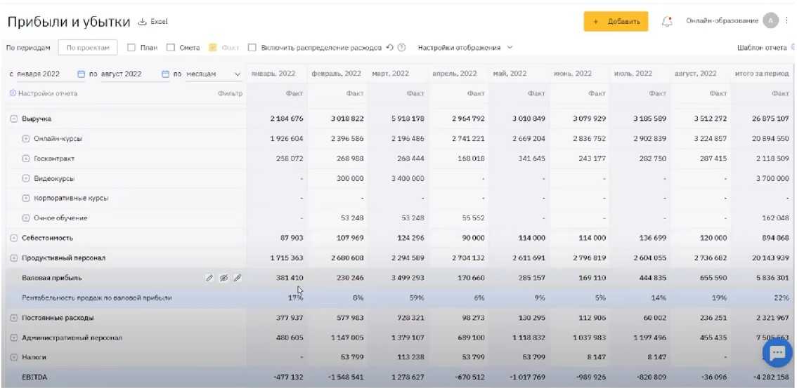 В отличие от предыдущего сервиса, группировка работает по всем расходам. Также, можно добавлять промежуточные значения: Операционная прибыль, EBITDA, EBIT, EBT.