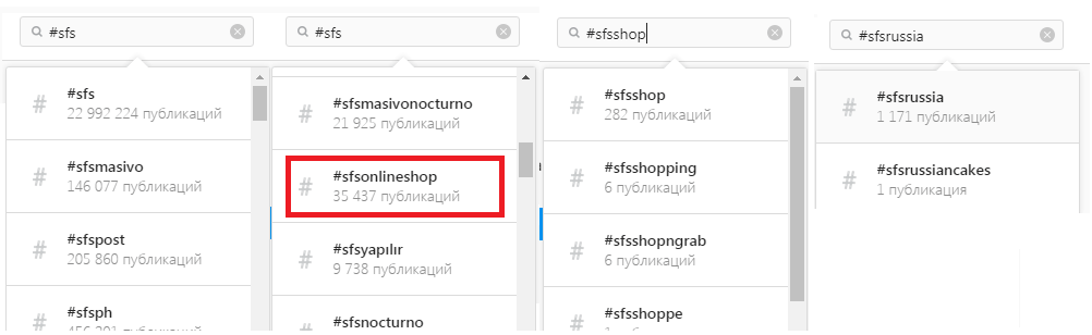 Всего публикаций с хештегом SFS очень много — обычно более 20 миллионов. Можно конкретизировать ЦА — к примеру, нишу бизнеса, страну, город — с помощью дополнительных хештегов: #sfssport, #sfsrussia, #sfsonlineshop и других.