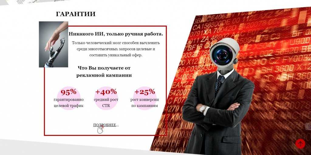 Гарантии на лидирующие позиции. Это сомнительное достижение, поскольку позиции зависят от максимальной цены за клик на аукционе, которой управляет специалист.