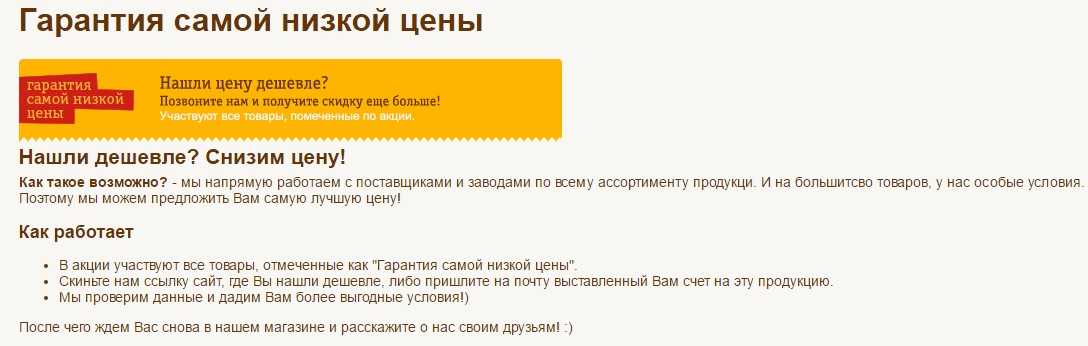 Самая низкая цена. Как правило, магазин предлагает клиенту найти цену на товар ниже, и дает более выгодные условия. Обязательно мотивируйте эту возможность, чтобы было понятно — вы работаете напрямую с поставщиками, а не продаете подделки, потому они дешевле.