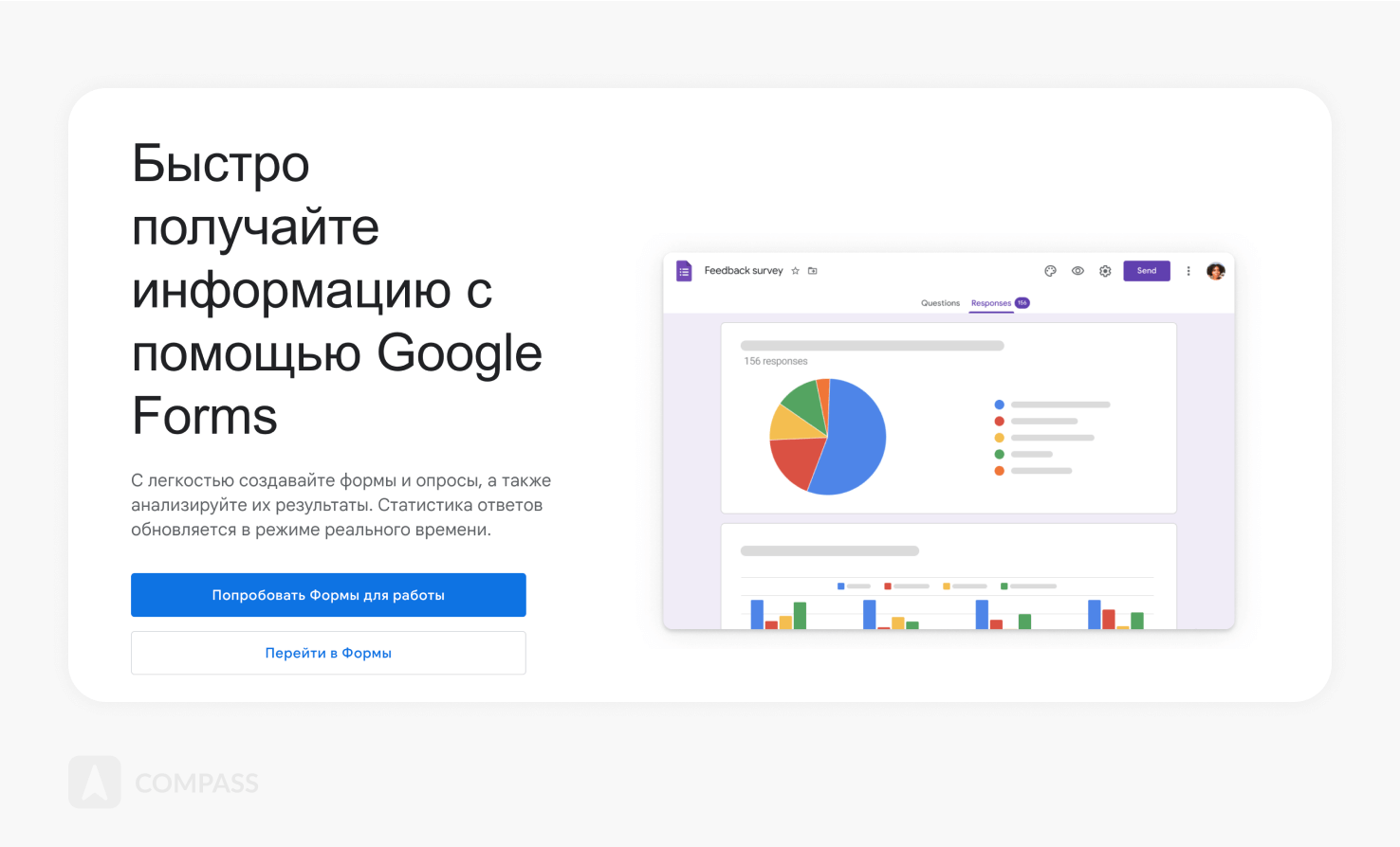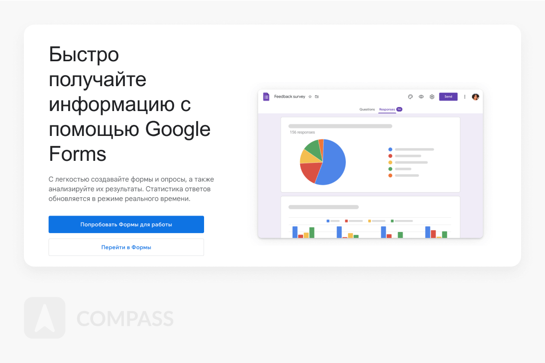 Google Forms – минималистичный сервис для проведения опросов и сбора информации, в том числе анонимно. Инструмент позволяет создавать анкеты, персонализированные или по готовым шаблонам, без необходимости привлекать разработчика. Формы с интуитивно понятным интерфейсом отправляют данные в классическую таблицу, в которой их легко анализировать.