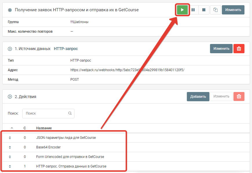 Мы настроили обработку. Указали «Источник данных», настроили 4 действия. Запустите обработку и она будет создавать сделки в вашем аккаунте GetCourse.