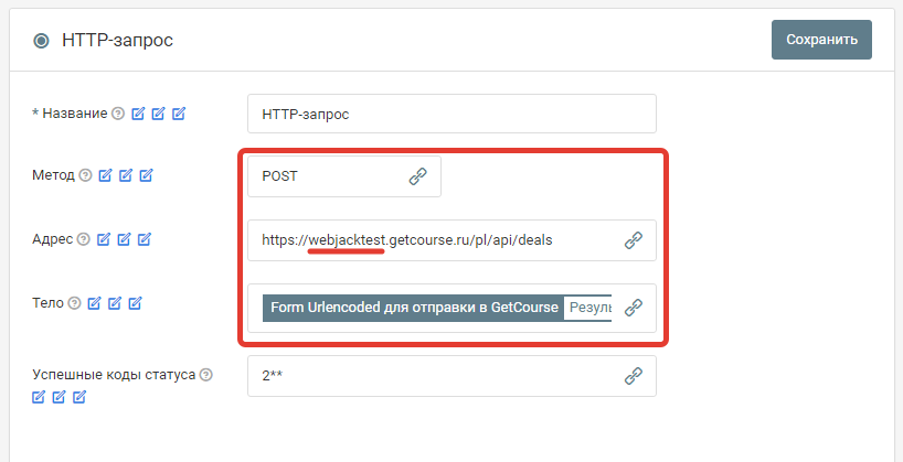 В поле «Адрес», необходимо указать адрес своего кабинета GetCourse (http://ВАШ_АККАУНТ.getcourse.ru/pl/api/deals).