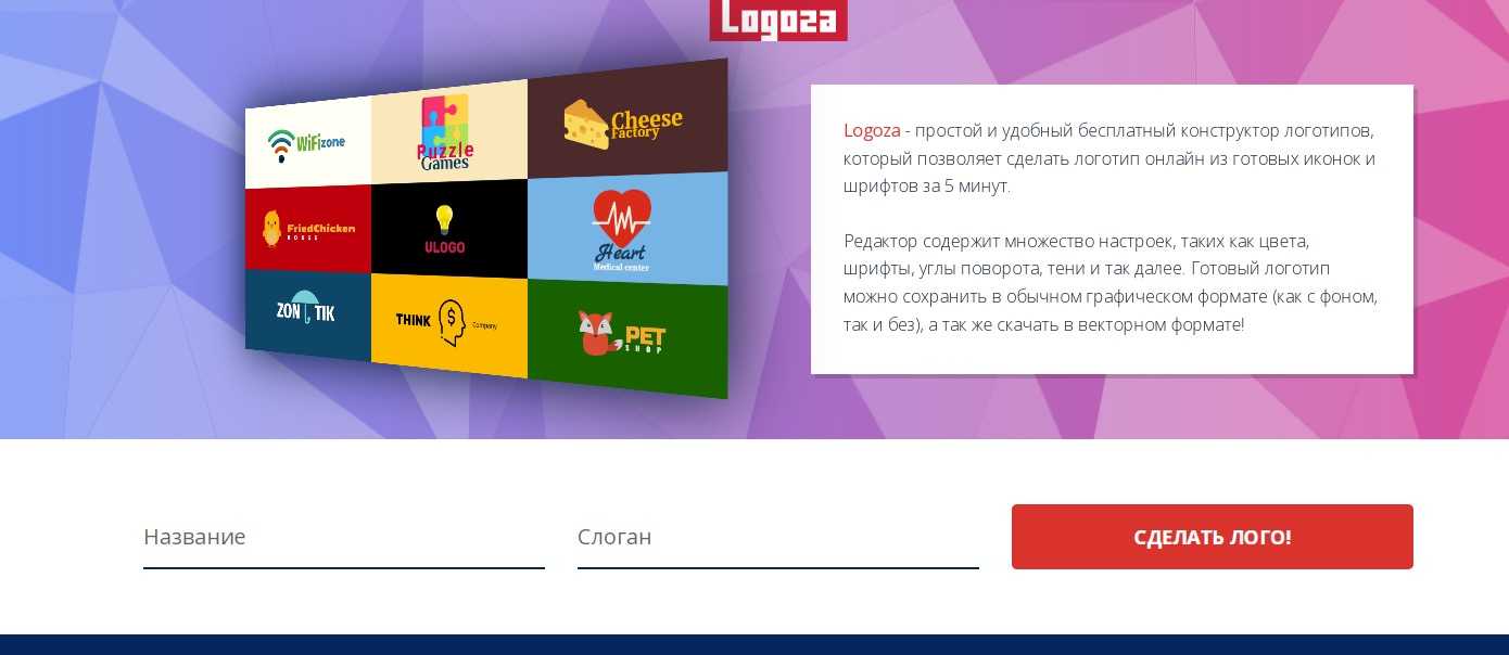 Российский простой и удобный бесплатный конструктор логотипов, который позволяет сделать логотип онлайн из готовых иконок и шрифтов. Позволяет скачать макет логотипа в хорошем качестве.