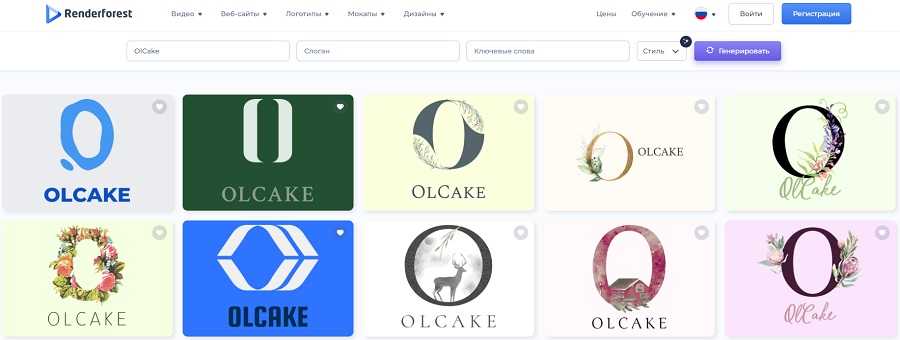 Принцип работы: Вводим название для логотипа и Renderforest сразу сгенерирует варианты. Понравившийся логотип можно отредактировать. Скачать логотип в формате PNG можно после регистрации в сервисе.
