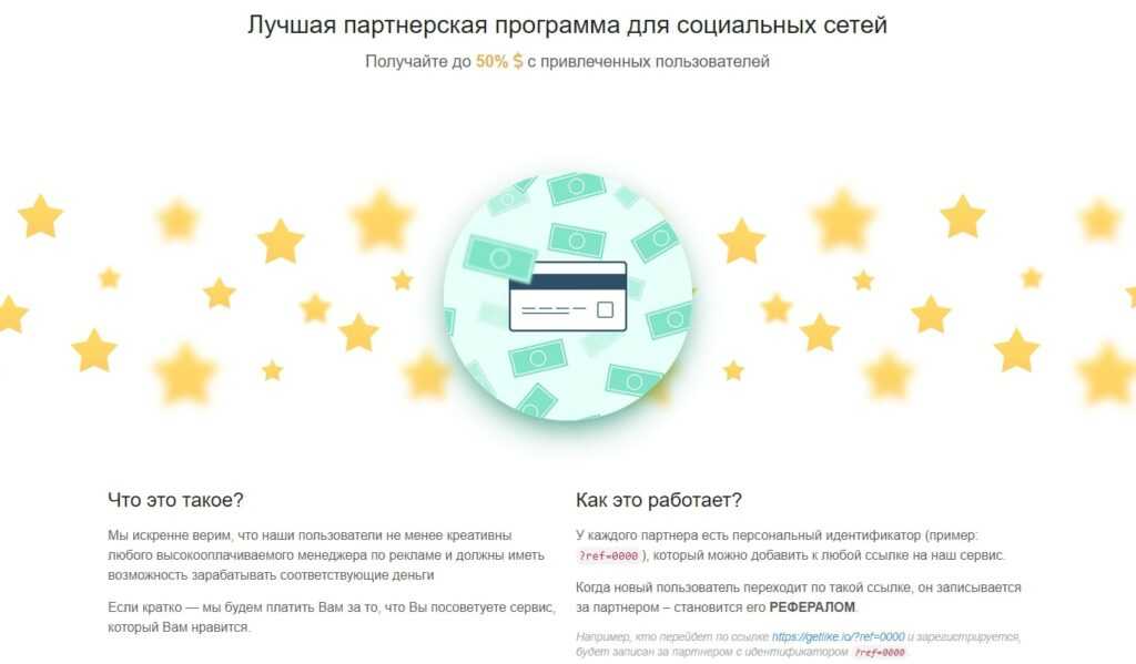 Что касается партнерской программы на сервисе Getlike, то здесь она весьма щедрая, так как ее размер составляет до 50% от заработка вашего реферала. Но с учетом мизерной оплаты, вы будете получать всего по 2-4 дополнительные копейки с каждого выполненного задания реферала.