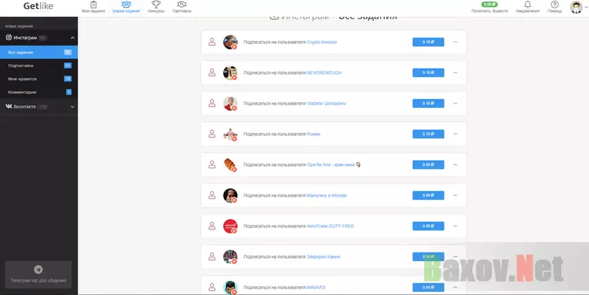 Я зарегистрировалась на сайте и решила выполнить несколько заданий. Что меня смутило, разница в расценках на странице «Стоимость услуг» и на странице «Биржа». Как вы помните, за сотню «друзей для общения», то есть подписчиков, getLike просит 60 рублей. То есть 60 копеек за одного. Но сам подписчик получит 7-14 копеек, если верить объявлениям.
