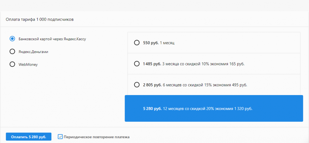 Малое количество способов оплаты. Оплатить можно банковской картой через Яндекс.Кассу, по Webmoney и Яндекс.Деньгами. В этом он похож на Mailchimp, где тарифы оплачиваются только через PayPal и платежные карты.