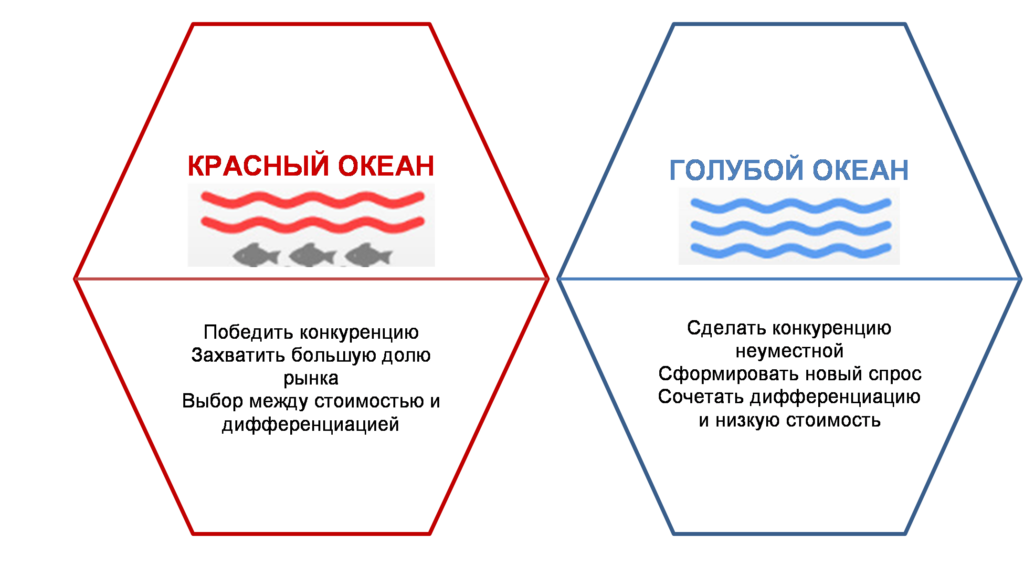 Авторы книги считают, что красный океан – это рынок, который переполнен конкурентами, а голубой океан – это неизвестный рынок, на котором нет конкурентов. В то время как в красном океане многие компании продают аналогичные продукты и пытаются конкурировать в основном с использованием различных ценовых стратегий, в голубом океане компании пытаются создать новый спрос.