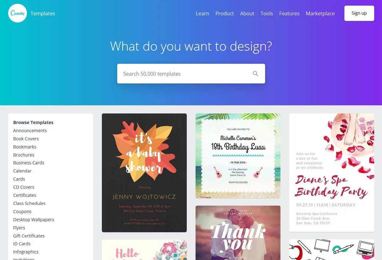 «Обзор шаблонов». Последняя вкладка — это поисковая система шаблонов. Их в Canva насчитывается около 50 000, в том числе календари, обложки для компакт-дисков, обои для рабочего стола, листовки, приглашения, ярлыки, письма, меню, информационные бюллетени, открытки, плакаты, рисунки для социальных сетей и многое другое. Вы можете разделить проекты на папки, в бесплатной версии предлагается два каталога.