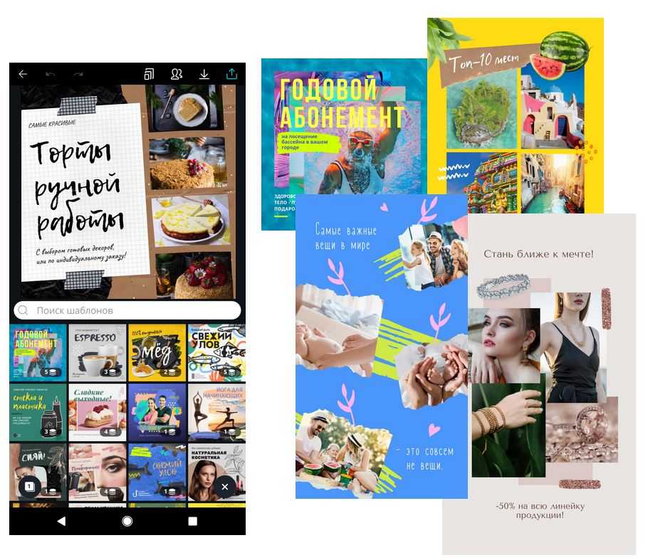 Широкий спектр шаблонов — визитные карточки, коллажи, эскизы, превью;