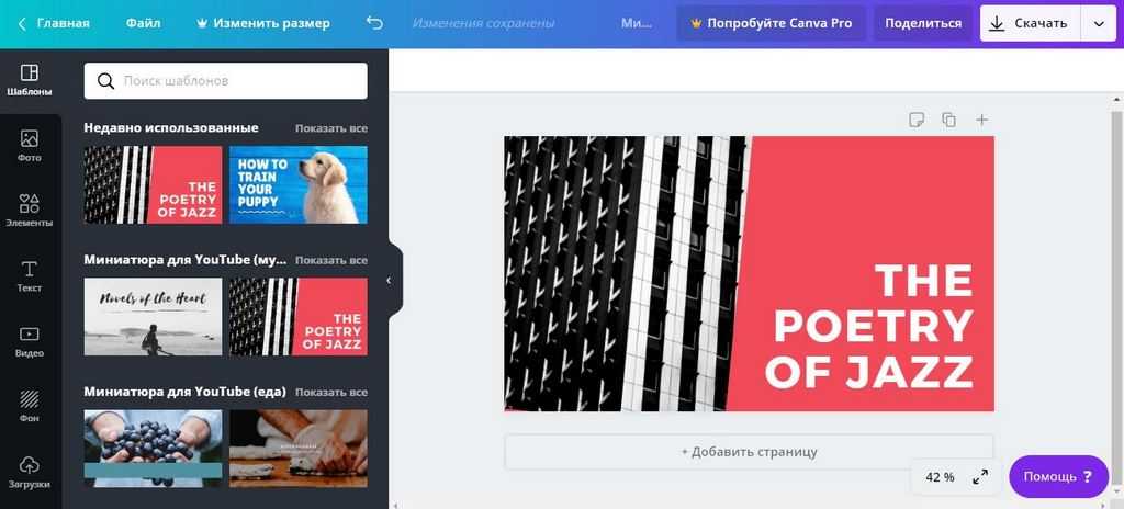 Например, мы выбрали «Миниатюра для YouTube». Откроется редактор: слева — десятки шаблонов, шрифтов, картинок, графических элементов (стрелки, фигуры и проч.), справа — чистый холст размером 1280 х 720 (формат для обложек YouTube видео). Нам нужно только перетащить на холст подходящий шаблон и отредактировать, как нам нужно.