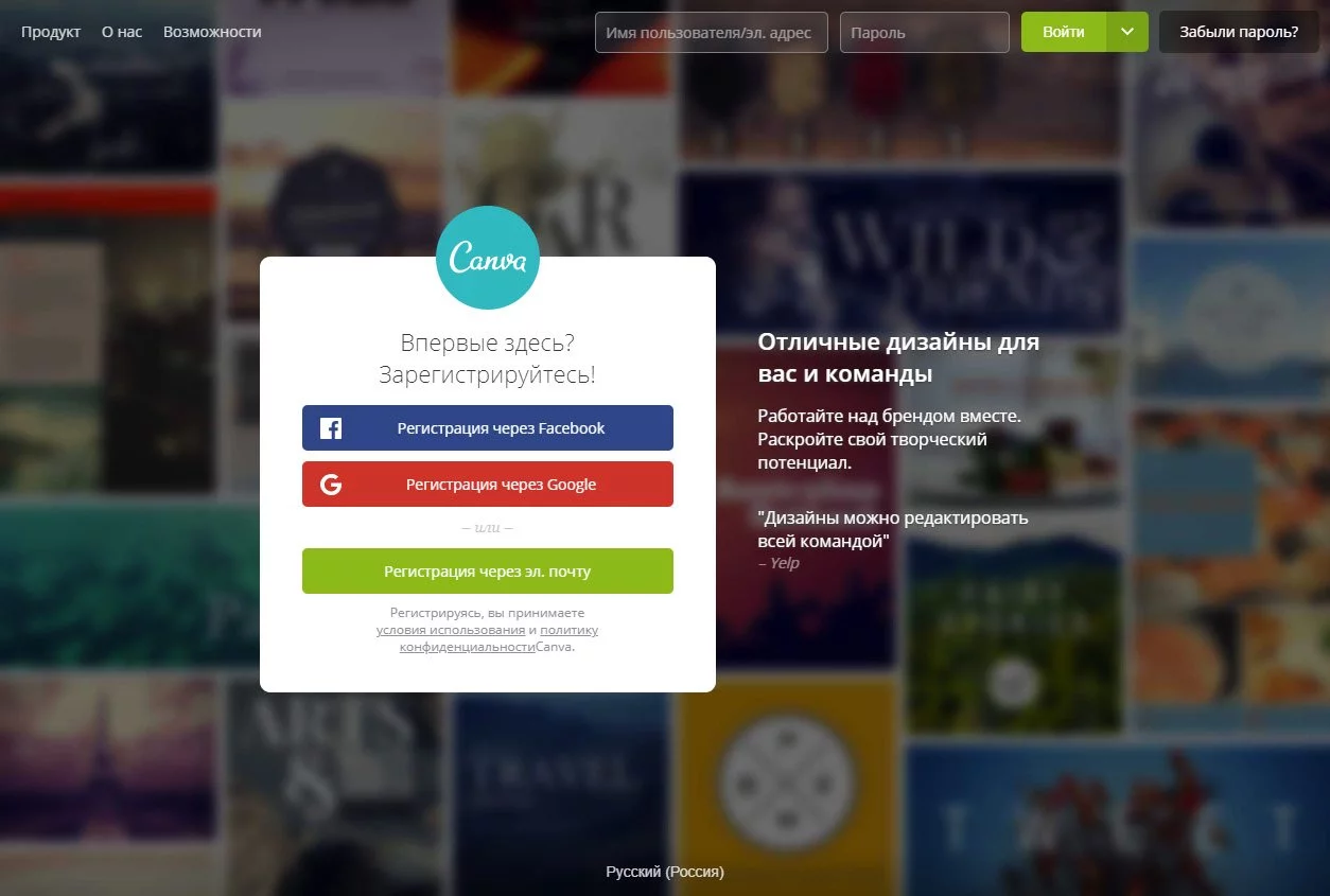 Чтобы полноценно работать в Canva и скачивать оттуда файлы, понадобится регистрация. В онлайн-сервисе можно зарегистрироваться через стандартную форму или авторизоваться через одну из соцсетей.