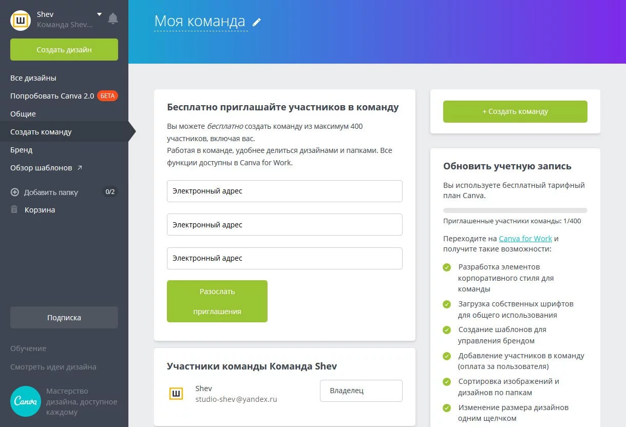«Создать команду» — удобная функция для тех, кто делает проекты сообща. Благодаря этому инструменты, Canva даёт возможность работать в команде или поддерживать связь с клиентами.