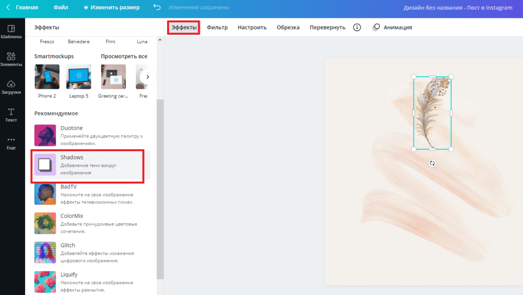 Если не хватает базовых возможностей редактора, в Канве доступно подключение дополнительных модулей. Например, чтобы сделать тень в Canva, выделите нужный объект и нажмите «Эффекты». Прокрутите панель эффектов вниз, найдите модуль Shadows. Кликните на него и выберите «Подключить».