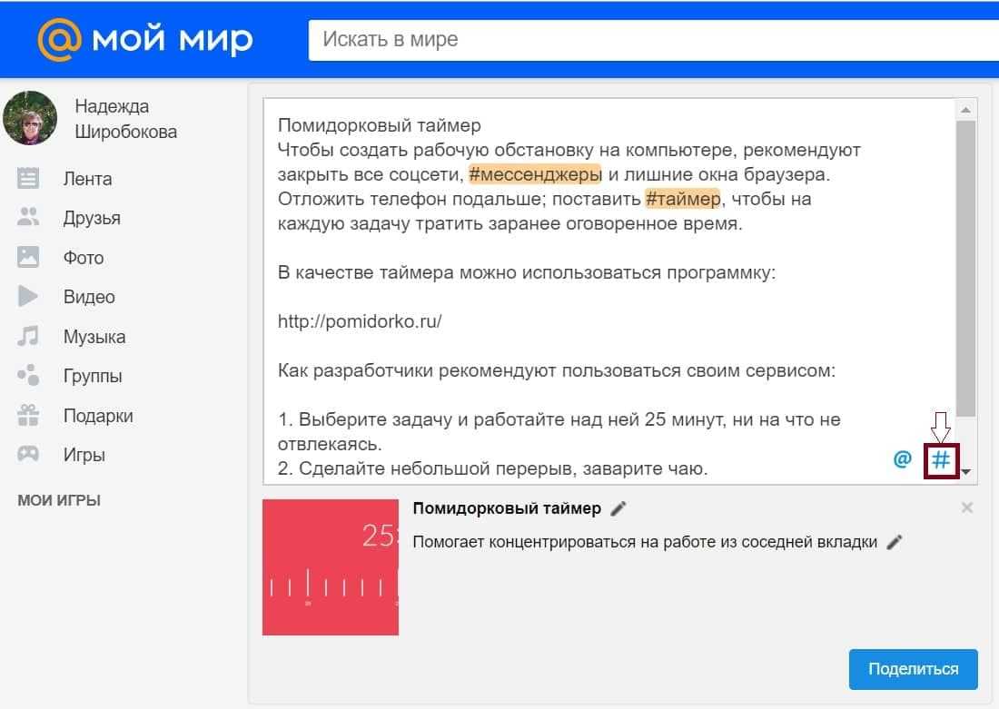 Рис. 7. Добавляем хештеги в запись в Моем Мире