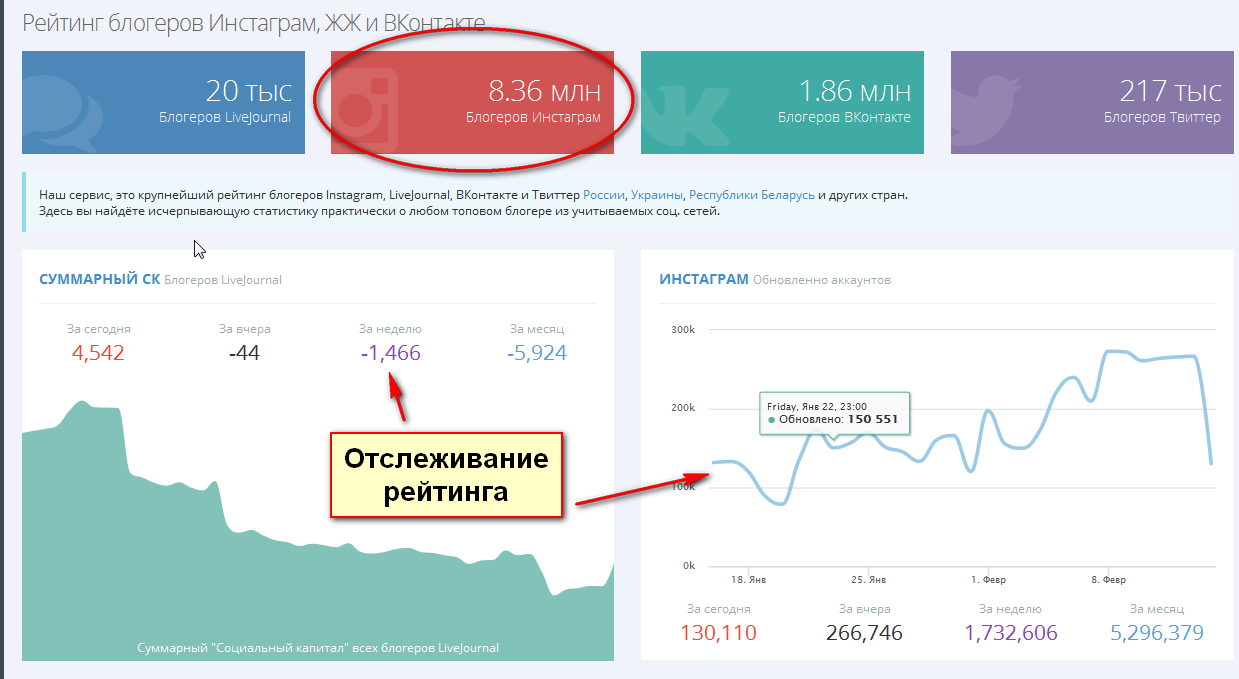 Сервис предоставляет данные об активности пользователей социальных сетей, точнее о тех, кого называют лидерами мнений. Более 8 000 000 аккаунтов в Instagram, миллионы блогеров из других социальных сетей. С помощью инструмента статистики можно отследить рост аудитории и активность конкретного блогера или даже целой группы (сообщества). Есть сортировка по рейтингу: ТОПы, по странам, областям и городам, по профессии или интересам (тематика).